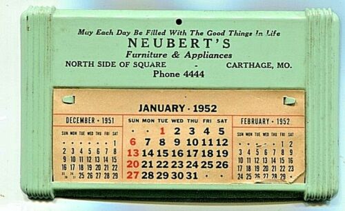VINTAGE 1951-1952 CARTHAGE ,MISSOURI NEUBERT`S FURNITURE DECO DESK CALENDAR