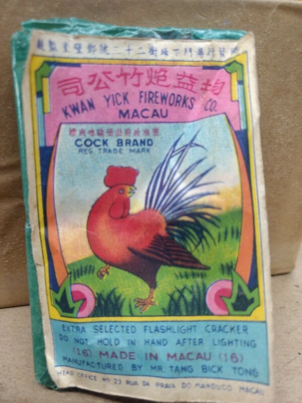 Title (ebay affiliate link): Vintage 1970s Cock Brand Flashlight Cracker Label ~ Made in Macau by Kwan Yick