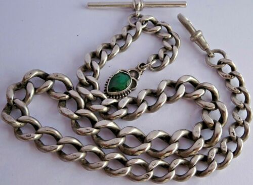 Stunning antique solid silver pocket watch albert chain & fob set w green stone
