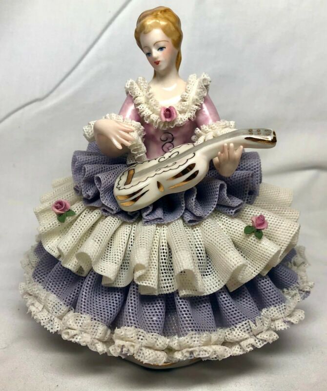 Title (ebay affiliate link): Dresden Lace Figurine Lady Seated Playing Guitar - Purple, White & Pink