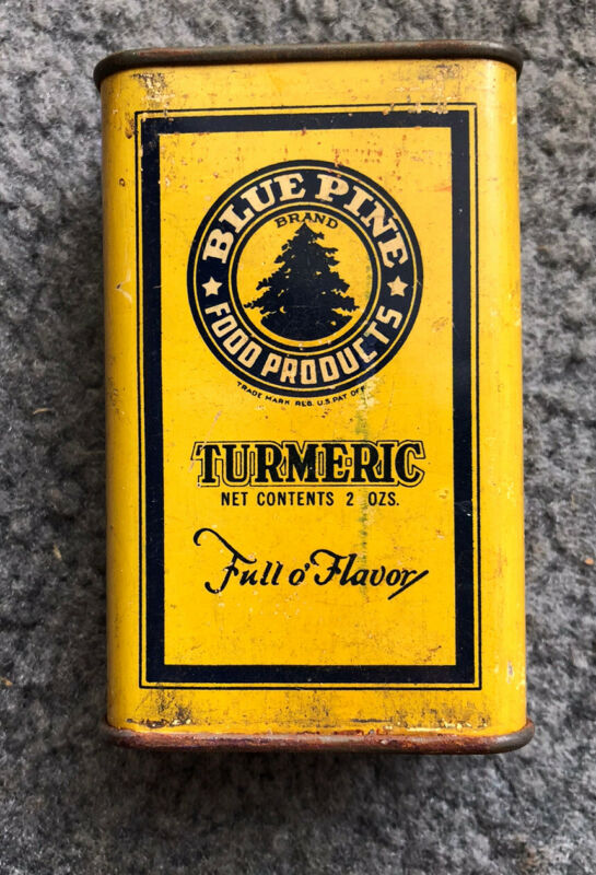 Title (ebay affiliate link): Vintage BLUE PINE Food Products Tumeric Tin Ogden Utah John Scowcroft & Sons Co.
