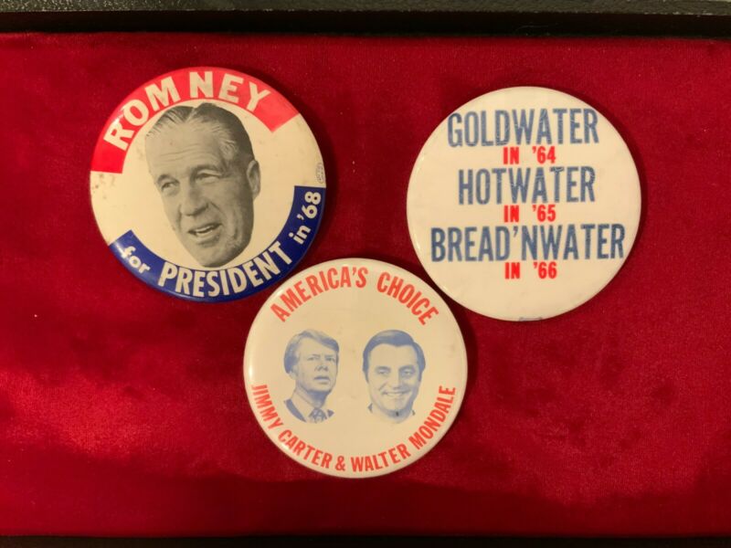 Title (ebay affiliate link): Political Buttons 3 1/4 inches Romney1968, 1964 anti-Goldwater, Carter & Mondale