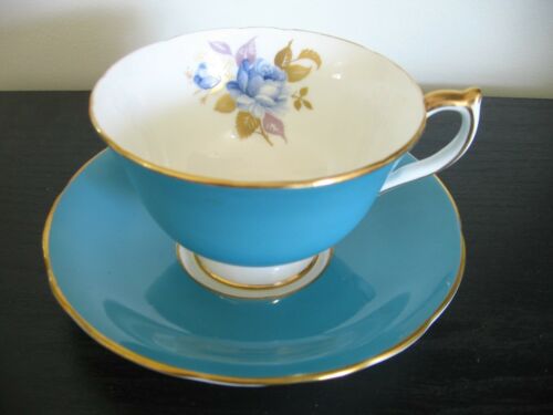 AYNSLEY TURQUOISE BLUE ROSE TEA CUP AND SAUCER