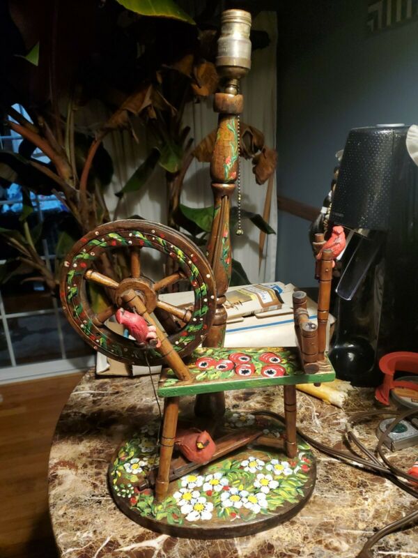 Title (ebay affiliate link): Victorian English Antique Spinning Wheel Lamp Fruitwood Wool Weaving Hand Painte