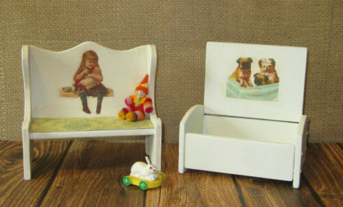 Vintage Dollhouse Furniture Settee Toy Chest and Toys Miniature Set