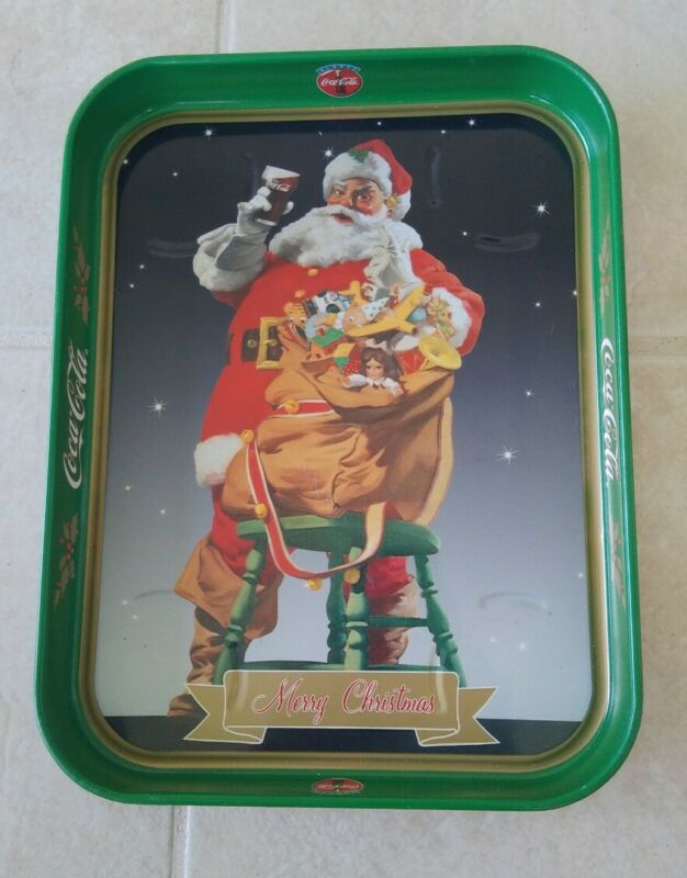 Title (ebay affiliate link): Coca Cola Christmas Santa Claus Green Holiday Metal Serving Tray Cookies Drinks