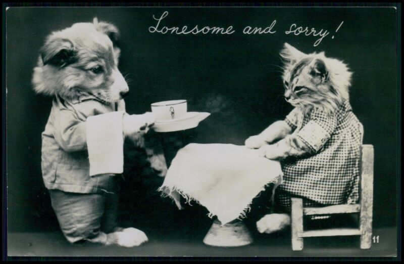 Title (ebay affiliate link): a22 Dressed cat dishes fantasy original 1930 old French RPPC real photo postcard