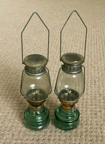 Title (ebay affiliate link): A PAIR OF VINTAGE 7.25" TALL, GREEN & CLEAR GLASS OIL LAMPS c/w WIRE HANDLES,VGC