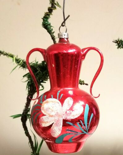 Title (ebay affiliate link): Red Coffee Urn, with annealed Handles. Flowers. 1920s Glass German Ornament.