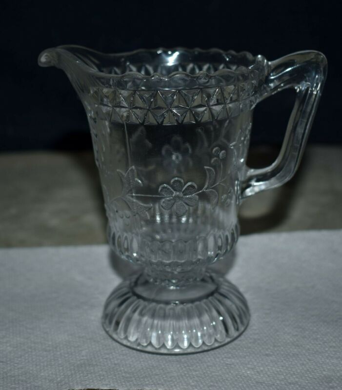 Title (ebay affiliate link): RARE ANTIQUE EAPG GLASS FOOTED CREAM/MILK PITCHER - LEAF & BERRY