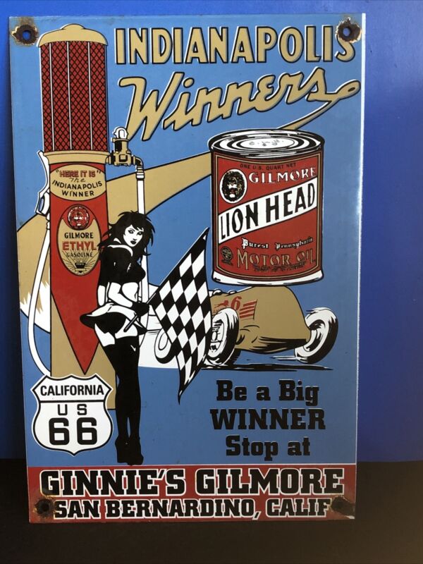 Title (ebay affiliate link): VINTAGE PORCELAIN US 66 GILMORE LION HEAD GAS AND OIL SIGN