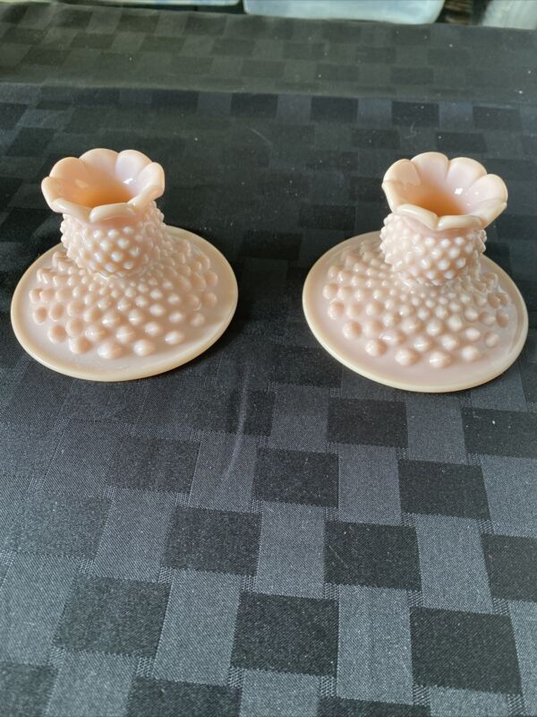 Fenton Candle Holders Pink Hobnail Milk Glass