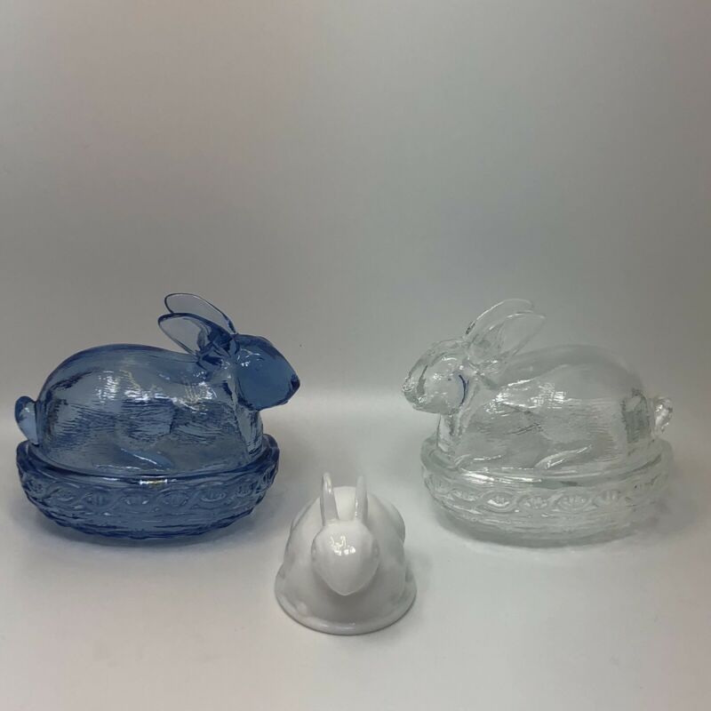 Title (ebay affiliate link): LE Smith Bunny On A Nest Lot Blue Glass And Clear (2) & Milk Glass Bunny Lid