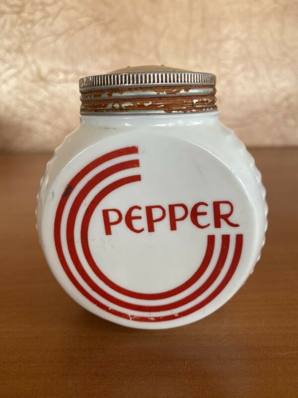 Title (ebay affiliate link): Vintage Anchor Hocking Milk Glass Red Lettering Pepper Shaker - Round Hoosier