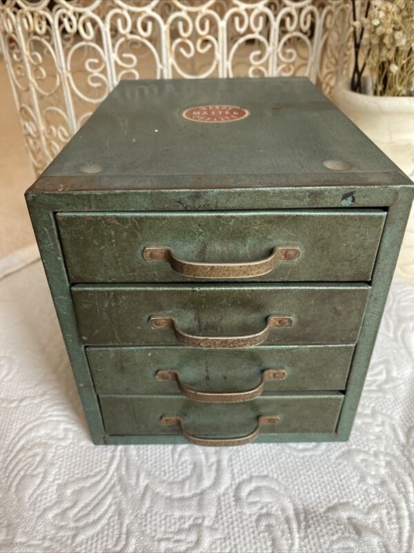 Title (ebay affiliate link): Vintage Wards Master Quality Metal Organizer Small Tool Box with 4 Drawers