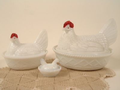 3 WESTMORELAND MILK GLASS HEN ON NEST 7 ", 5 " & 2"
