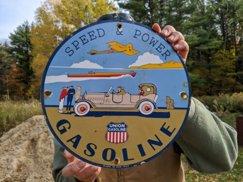 Title (ebay affiliate link): OLD 1934 UNION SPEED & POWER GASOLINE PORCELAIN GAS SERVICE STATION PUMP SIGN