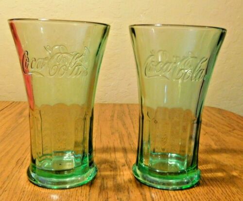 Title (ebay affiliate link): 2 Libbey Coca Cola Green Flared Glass Tumbler 16 oz Heavy Coke Glass 6 1/4" tall