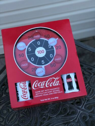 Title (ebay affiliate link): NIB Coca Cola Game Set Bottle Cap Dart Board Ceramic Mugs & Pretzels Coke 3oz