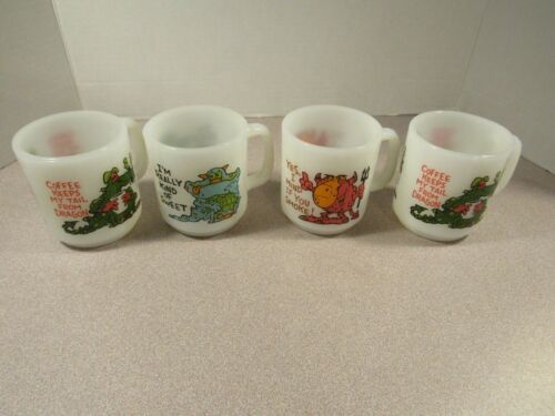 Nice Set of 4 Vtg White Glasbake COFFEE Mugs Dragon, etc. with sayings.