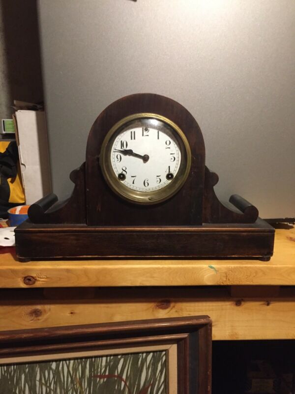 Title (ebay affiliate link): Antique Sessions Wooden Wind-up Mantle Shelf Clock 8 Day Cathedral Gong Works