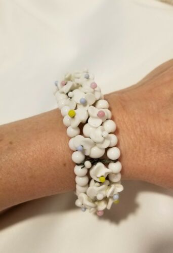 Title (ebay affiliate link): Vintage milk glass flower bracelet multi strand multi color bead memory wrap