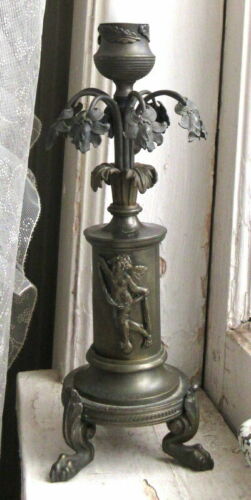 Antique NEOCLASSICAL FOOTED BRASS CANDLE HOLDER Cherub Motif Lion''s Feet Flowers