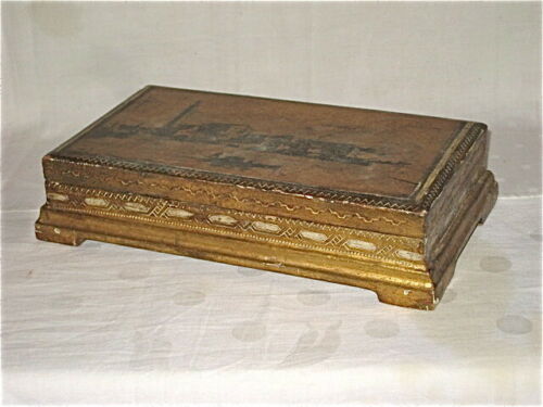 Vintage FLORENTINE GILT & DECOUPAGE Italian Wood Trinket BOX Chippy Gold & White