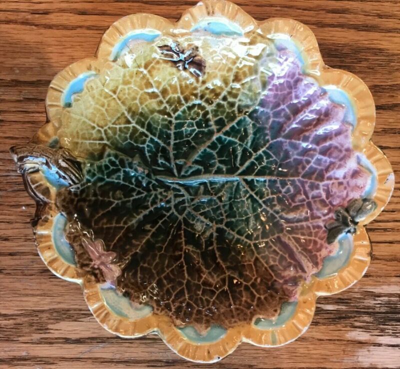 Antique Majolica Butter Pat  Multicolored Leaf Dragonfly