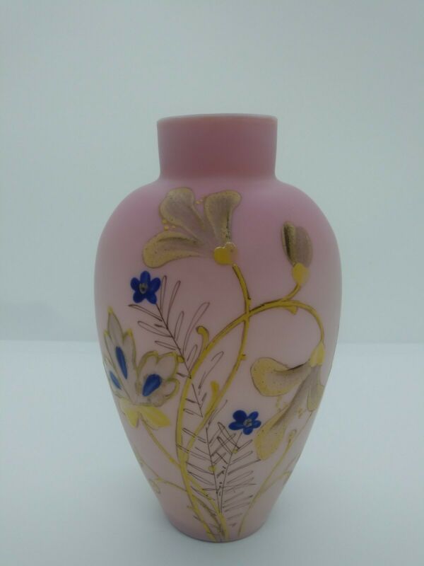 ANTIQUE HARRACH MT WASHINGTON PEACH BLOW GLASS ENAMEL PAINT GOLD FLORAL 6" VASE