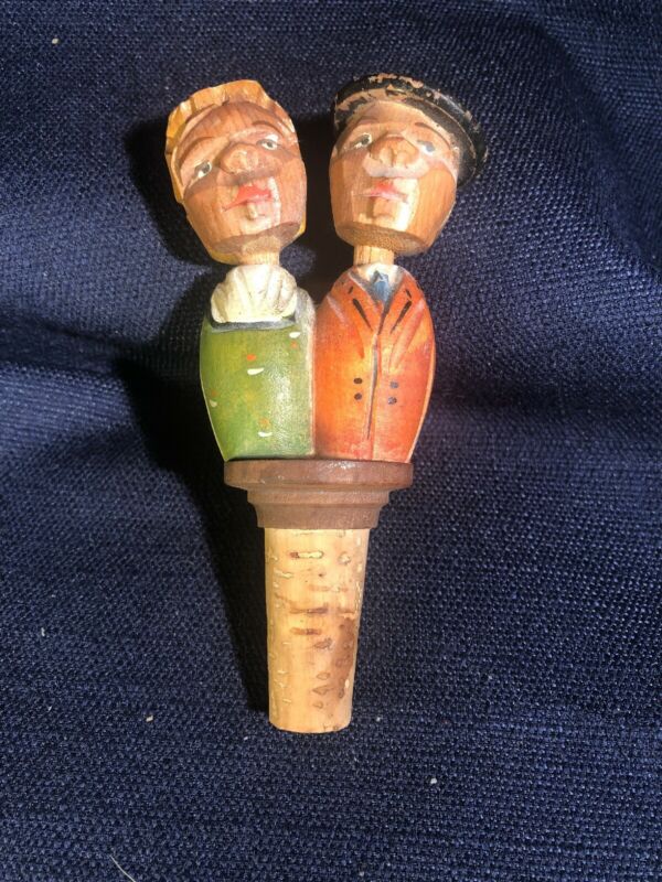 VINTAGE WOOD CARVED KISSING COUPLE BOTTLE STOPPER CORK