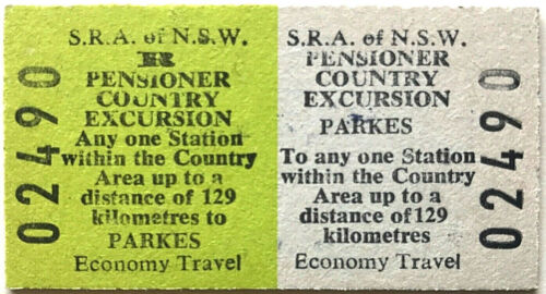Title (ebay affiliate link): NSWR Ticket - PARKES - Pensioner Country Excursion - up to 129Km Economy Return