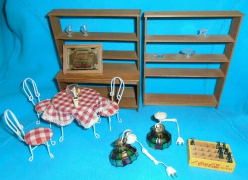 Vintage Dollhouse Furniture Lot - Ice Cream Table+ 3 Chairs Shelves Lamps Glass