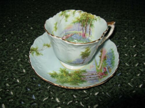 VTG Ansley Bone China, Tea cup & Saucer, Light Blue scenery, gold trim