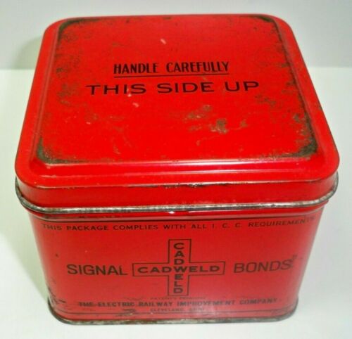 Title (ebay affiliate link): Vintage Cadweld Signal Bonds Tin Electric Railway Improvement Co. Cleveland Ohio