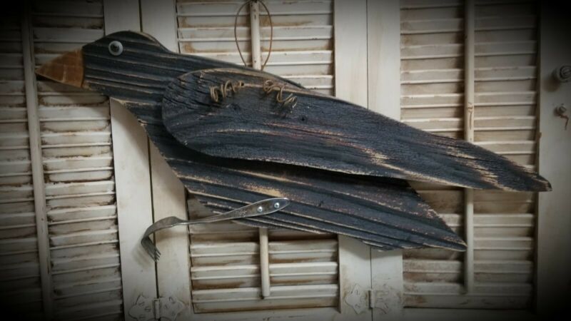 Primitive Handcrafted Wooden Crow Wall Door Hanger ~Folk Art ~ Raven ~ Halloween