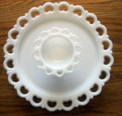 Vintage Milk Glass Laced Scalloped Platter W/Dip Dish