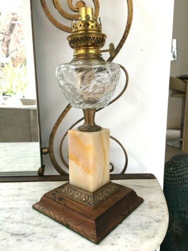 Title (ebay affiliate link): antique small glass oil lamp with Kosmos burner on marble wood base