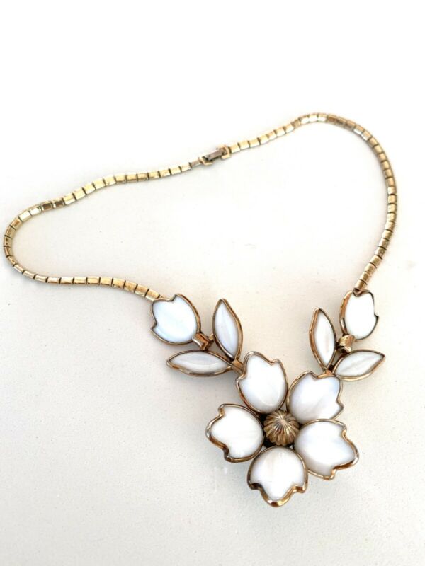 Vintage Crown Trifari Molded Milk Glass Flower Necklace