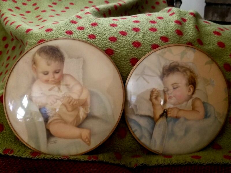 Vintage Pair Baby Pictures By Peter Watson Studio Convex Bubble Glass 6 Inches
