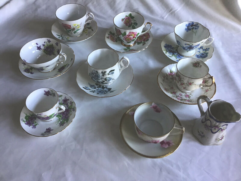 Set Of 8 Vintage Teacups And Saucers Pink Blue Purple White S10