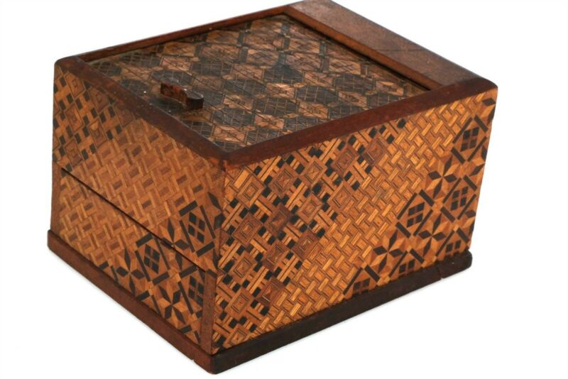 Title (ebay affiliate link): Antique Wood Inlayed Table Box Roll Top Nick Nack has Bakelite Gaming Pieces