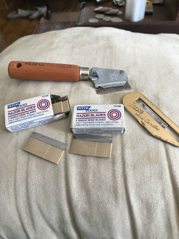 Title (ebay affiliate link): Vintage Warner Tool Red Wood Handle 6" Razor Blade Cutter Made in USA And Blades