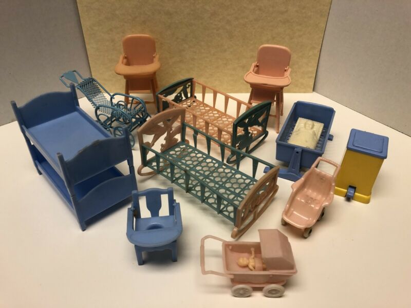 Lot BABY NURSERY ITEMS Vintage Tin Dollhouse Furniture Ideal Renwal Plastic 1:16