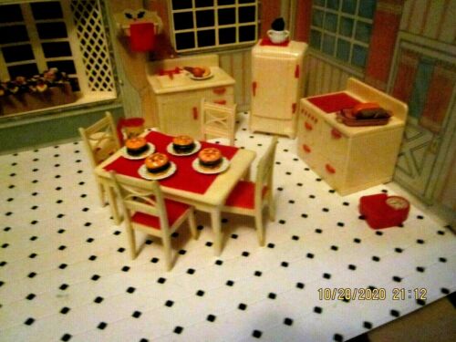RENWAL CREAM & RED KITCHEN SET W/ACCESSORIES PLASTIC DOLLHOUSE FURNITURE Maex Pl