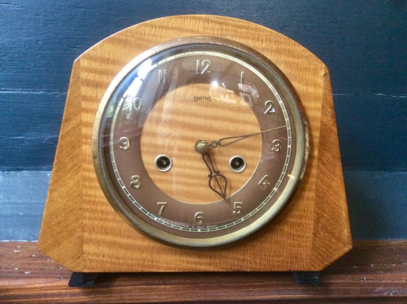 Title (ebay affiliate link): Antique Vintage ART DECO Mantel Clock,SMITHS 8 Day Movement,Modernist Wood Case