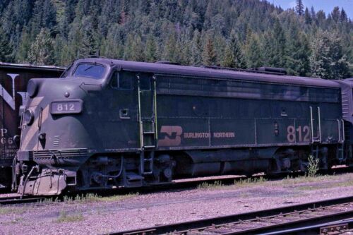 Title (ebay affiliate link): ORIGINAL KODACHROME BURLINGTON NORTHERN RAILROAD F9A # 812 ESSEX, MT 1975