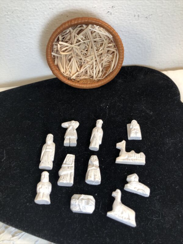 Title (ebay affiliate link): Vintage 11 PIECE MINIATURE CHALK WARE NATIVITY PIECES IN BASKET