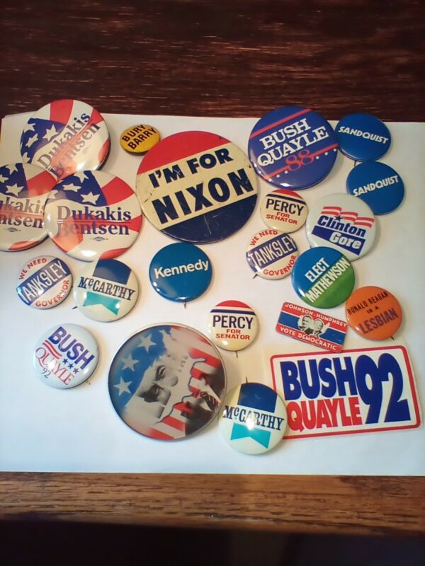assorted campaign buttons Nixon, LBJ, McCarthy, Dukakis