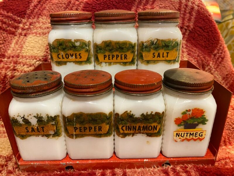 Title (ebay affiliate link): Vintage Milk Glass Spice Jar set With Red Metal tops and Rack